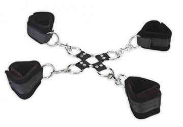 The set includes four adjustable, velvet-lined cuffs connected to a sturdy central O-ring via stainless steel hardware. Use it as a classic hogtie to leave your lover deliciously vulnerable, or detach the cuffs to mix and match with other restraint systems. Soft padding keeps play comfortable while secure Velcro closures make adjustments quick and easy.