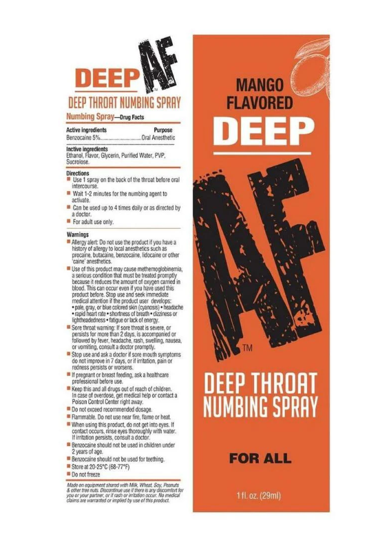 The Deep AF Mango Numbing Spray is designed to support comfort and confidence with a fast-acting oral formula. Infused with a tropical mango flavor, this spray delivers a refreshing taste while providing targeted desensitizing support where you need it most.