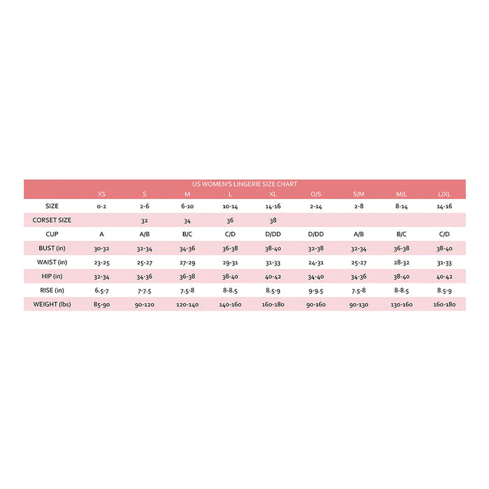 - Fit: C/D cup, 36–38” bust, 29–31” waist, 38–40” hips, 140–160 lbs
