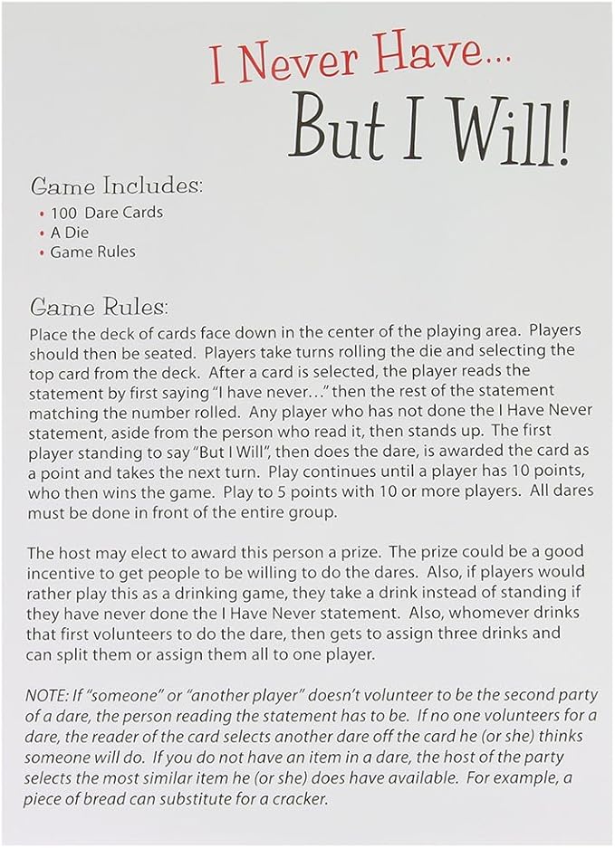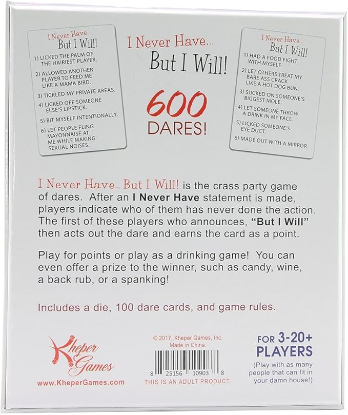 With over 600 hilarious and risqué dares, this game guarantees laughter, blushes, and unforgettable moments. Players take turns making “I Never Have…” statements, and the first person to boldly declare “But I will!” must act out the dare to earn their point. Whether you’re playing for bragging rights or turning it into a steamy drinking game, this game brings out everyone’s wild side! 🍷🔥