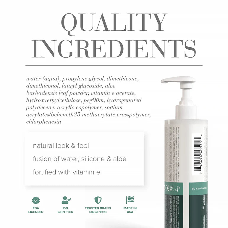 Water (Aqua), Propylene Glycol, Dimethicone, Dimethiconol, Aloe Barbadensis Leaf Powder, Vitamin E Acetate, Hydroxyethylcellulose, Polysorbate 20, PEG-90M, Polyisobutene, Acrylic Copolymer, Polyacrylate 13, Chlorphenesin