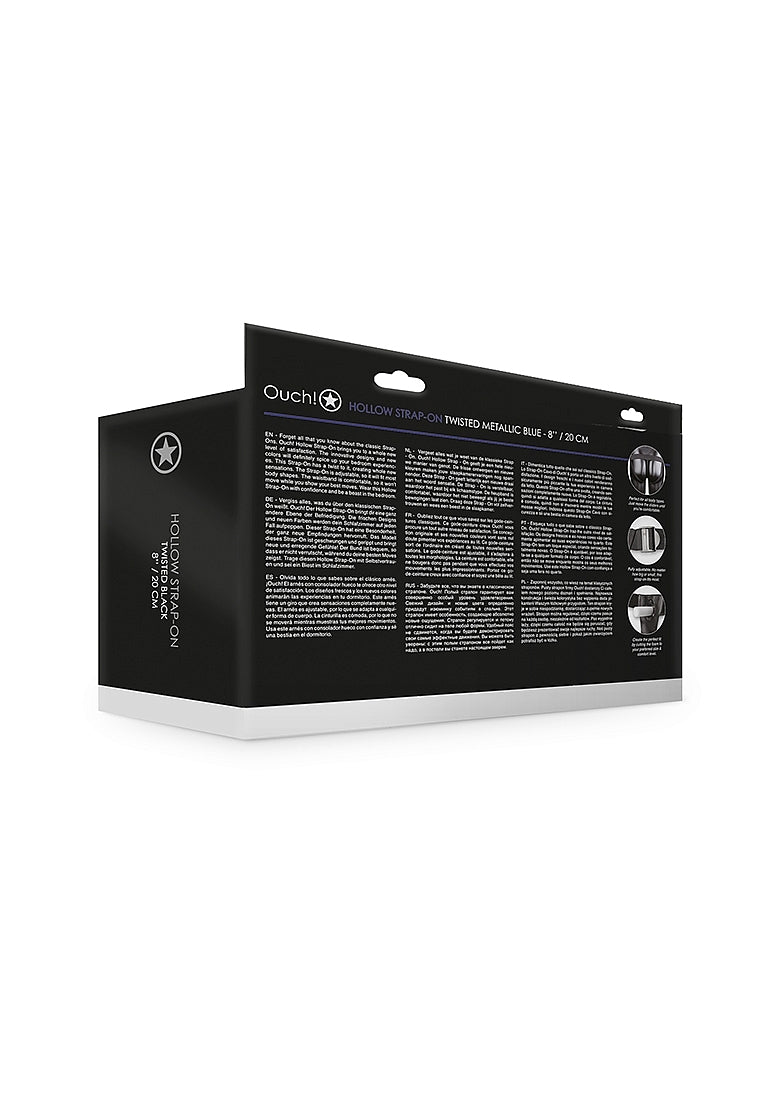 The Ouch! Ribbed 8 Inch Hollow Strap-On with Balls in Metallic Blue is designed to bring bold styling and versatile performance to wearable play. Featuring a curved and ribbed design, this model offers added texture and shape while maintaining comfort and control.