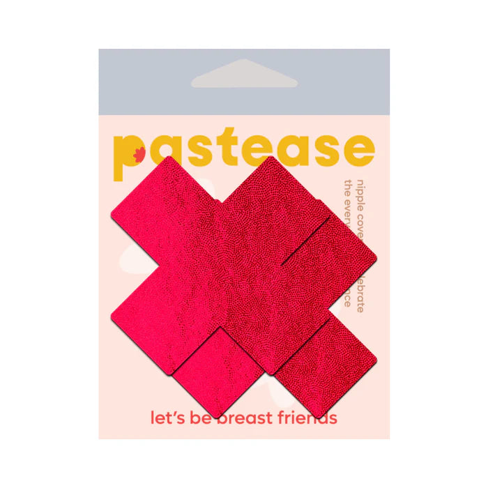 The Pastease Plus X: Liquid Red Cross Nipple Pasties are designed for bold, fearless fun. Handmade in the USA from smooth, shiny pleather material, they mold seamlessly to your curves while resisting wrinkles—even over hardening nipples.