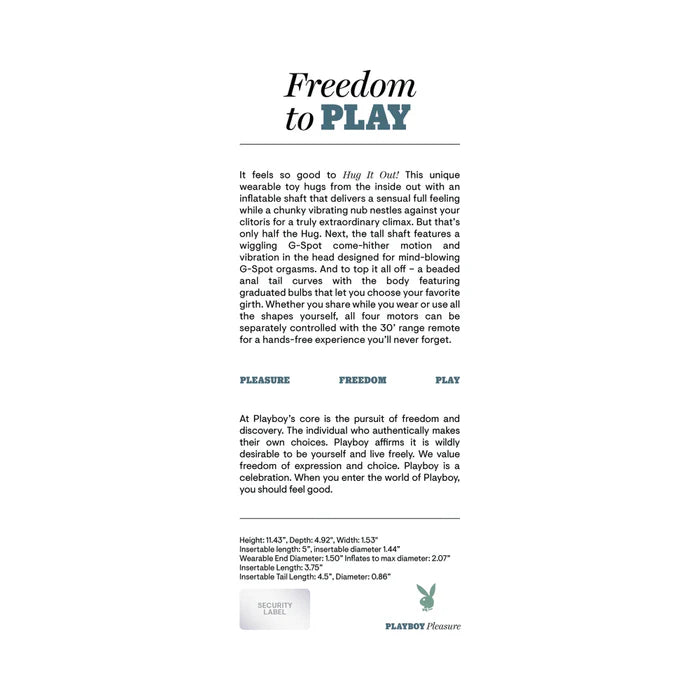 The Playboy Hug It Out Acai is a groundbreaking wearable toy that embraces you from every angle—literally. With four separate motors and an inflatable shaft, this toy takes triple stimulation to unforgettable new heights.