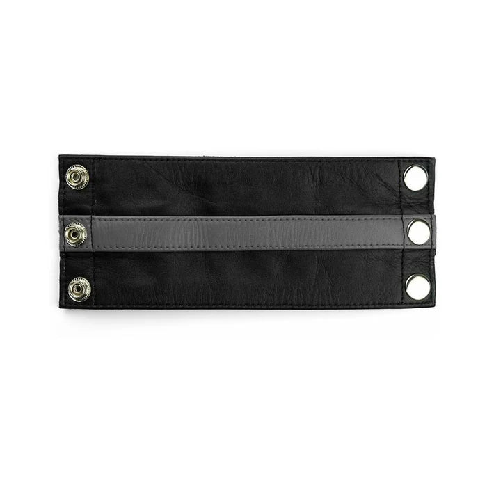 The black leather base is accented with a grey stripe, adding a subtle visual detail while maintaining a sleek and versatile appearance. Built for both functionality and style, it provides a compact solution for carrying essentials without bulk.