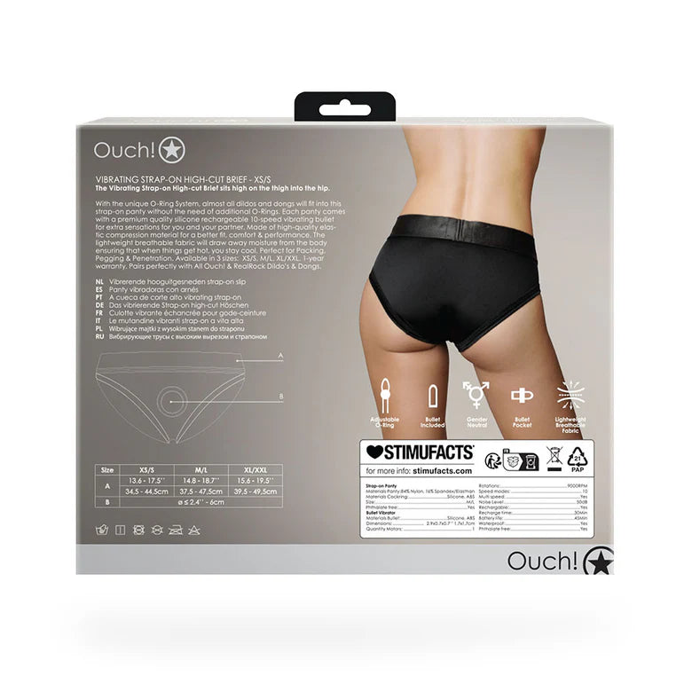 The Ouch! Vibrating Strap-on High-cut Brief Black XS/S is designed to deliver a sleek, flattering fit with reliable performance and comfort. Featuring a high-cut style that sits above the thigh and along the hip, this design offers a modern silhouette while maintaining support and stability.