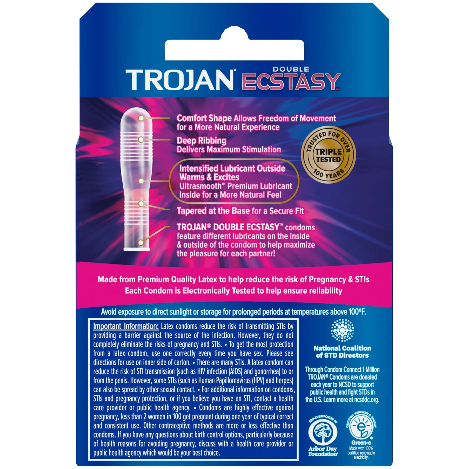 Made from premium latex, Trojan Double Ecstasy helps reduce the risk of pregnancy and STIs, while letting both partners experience bliss in their own way.