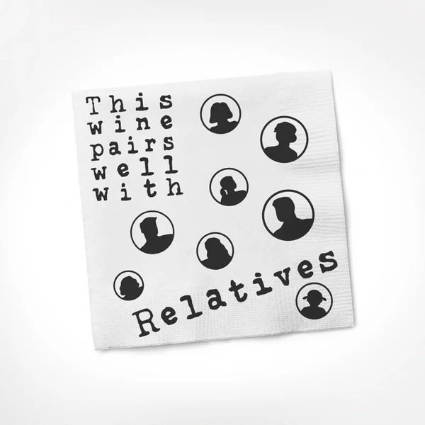 Perfect for parties, cookouts, or hostess gifts, these 3-ply beverage napkins are soft, durable, and the ideal size at 5 inches square. The hilarious message “This Wine Pairs Well With Relatives” is printed boldly across each napkin — because sometimes, the truth deserves a toast. 🥂